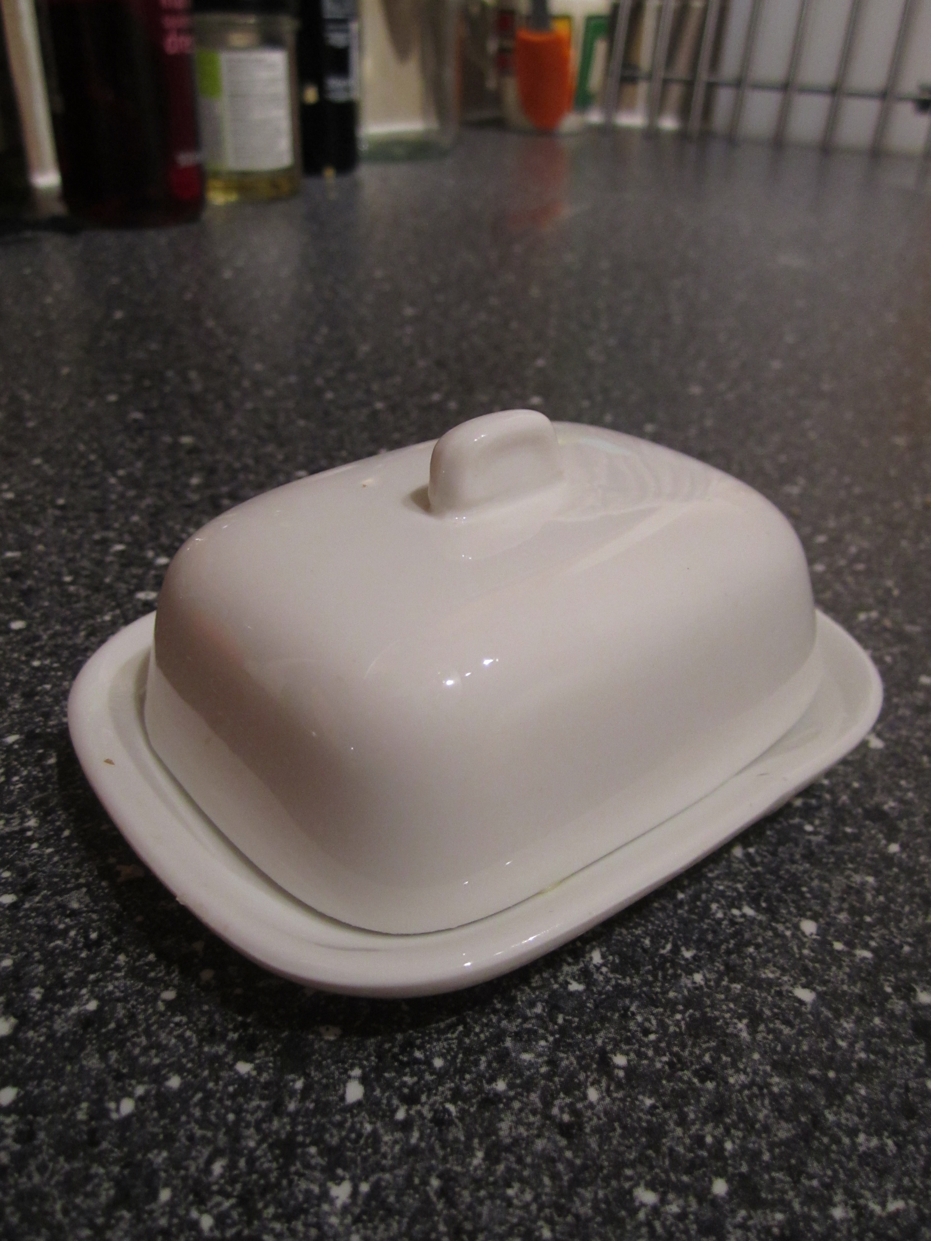 Within the last week I have visited both my parents and brother and received gifts from each. My mother bought me a miniature butter dish. Before I received it, I didn’t think i needed it my life, but now I have it, I am loving it! When I lived with my parents we always had a butter dish that seemingly floated around the kitchen to various locations. Since living on my own I admit I moved to the convenience of spreadable butter, but that shall be a think of the past. The dish is the perfect size for a knob of butter for my toast in the morning or after work crumpets.