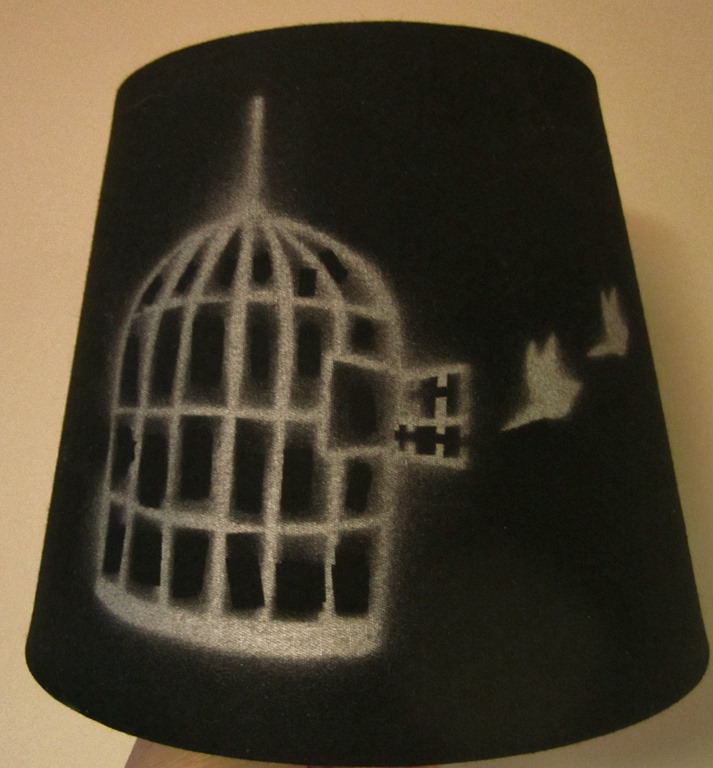 Recently I got a bit addicted to lighting, mainly table lamps and lampshades. I picked up a small glass table lamp from Ikea and a black lampshade from Habitat. My first thought was to cut the London skyline into the lampshade, but I couldn’t think how it would work. I then decided to spray paint a simple shape on to it, and hence I chose a birdcage, with 2 birds flying away.